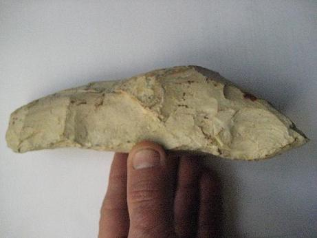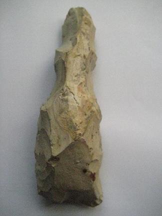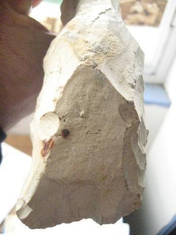 L'échancrure de la partie opposée au tranchant nous laisse croire à un amménagement pour emmancher l'outil de plus de huit centimètres , je n'ai rien vu de tel dans la litterature préhistorique pour le moment.
