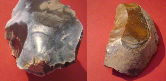 Je suis assez stupéfaite de trouver si facilement des pierres taillées souvent regroupées dans des mêmes champs ; il suffit d'ouvrir grands les yeux, de voir émerger un petit silex de le ramasser et bingo ! Ces 3 là je les ai trouvée en très peu de temps (1 h) je ne comprends pas pourquoi ces pierres sont restées si longtemps en place. Les hommes qui les taillaient les ont abandonnées sur place.