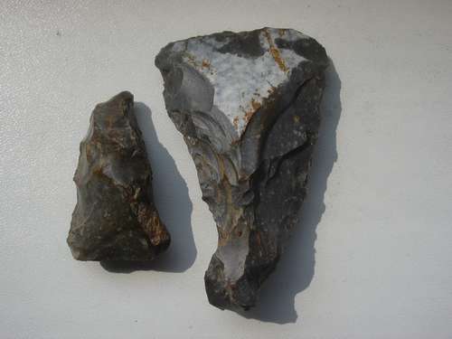 deux tranchets dont le grand peut être retaillé en hache plus un chopping toll et un percuteur .