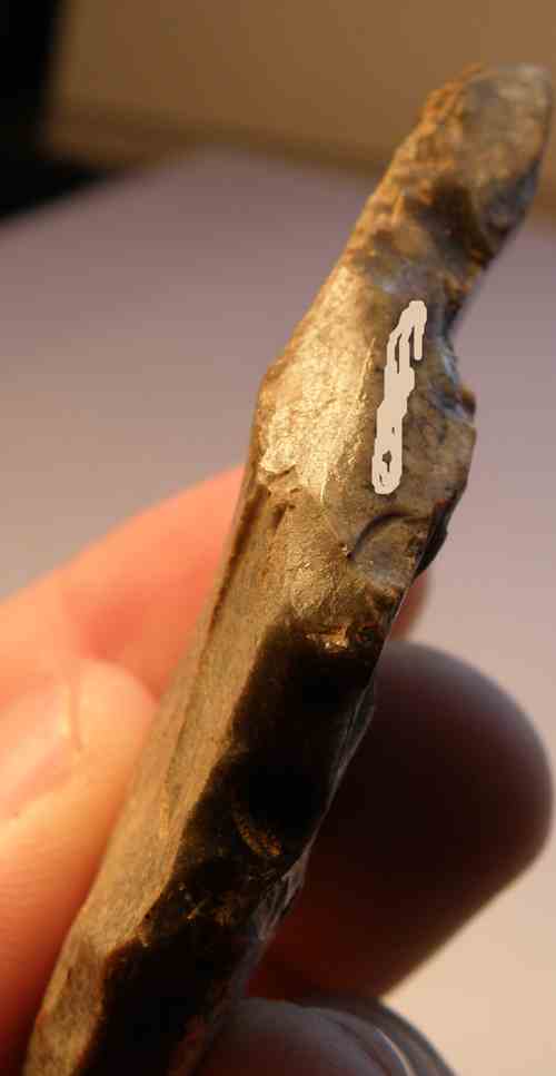 Je ne pense pas que la pièce soit mutilée, on distingue une ou deux retouches a ce niveau en R0 et au moins une en R1. Donc pour moi, c'est l'outil tel qu'il a été abandonné. Qu'il y ait eu régularisation, réafutage ou autre au cours de l'utilisation du silex, c'est possible. Mais à mon sens, ce qui compte c'est la pièce tel qu'elle nous est parvenu...