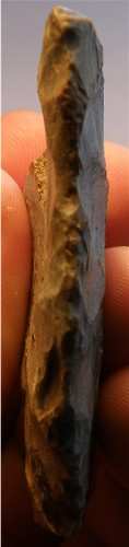 je poste donc deux autres photos du côté opposé au tranchant ... sur la première image on voit trés bien que l objet est brisé assez recemment par l absence de patine, on peut imaginer que la zone manquante aurait pu être un tranchant...la seconde image montre ce que je pensais être une fracture mediane de la pièce , fracture ancienne car la partine est identique au reste de la pièce ....Qu'en pensez vous au vu de ces nouveaux clichets?