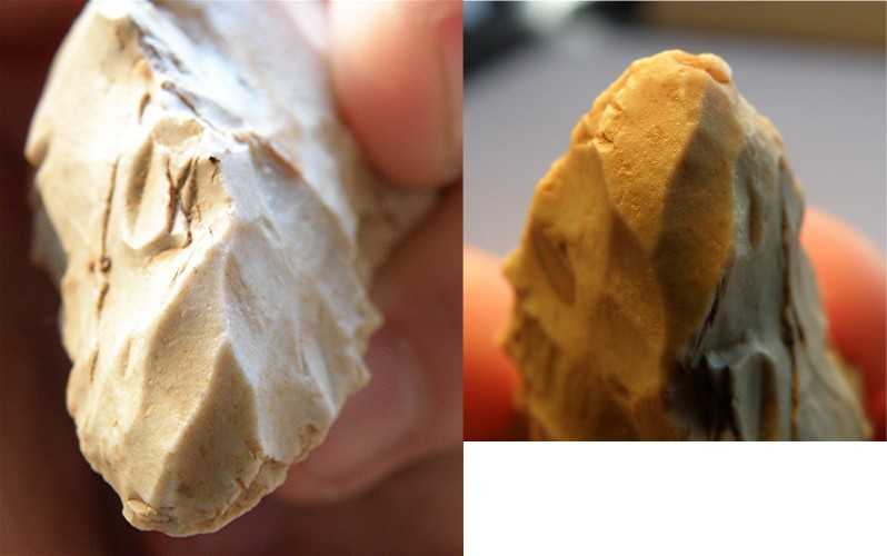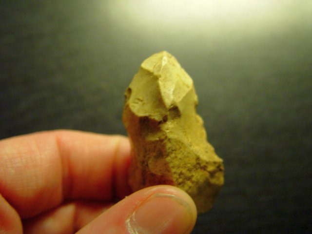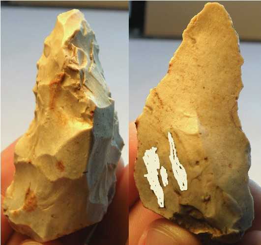 je vous soumet ce que je pense être un superbe grattoir à museau typiquement aurignacien trouvé miraculeusement épargné dans un labour , la pièce est absolument intacte et possède une patine crème zonée d'oxydes ferriques