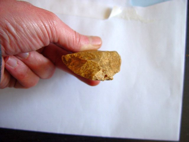 Par contre je n'arrive pas a voir si il s'agit d'une piece sur éclat ou sur gamet du fait de l'usure du silex qui est devenu granuleux.