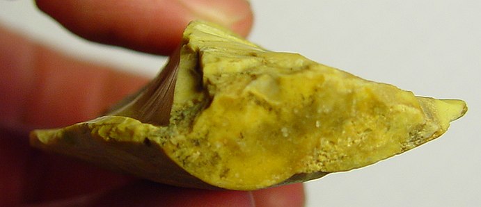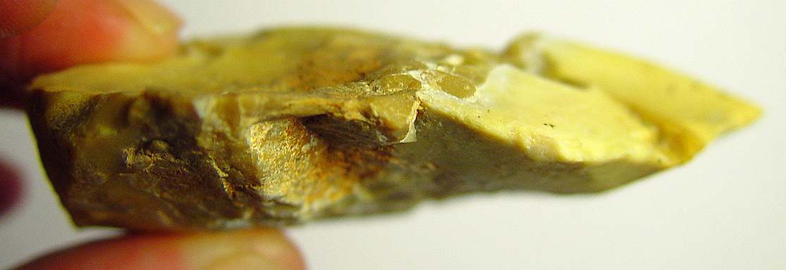 Par rapport à l’inhomogénéité du silex, celui-ci est tout de même assez solide puisqu'il a été taillé (quand je dis ça je pense surtout à l’enlèvement le long à gauche de la ''dorsale'' (photo en R6) et qui dégage une sorte d'ailerons. (cela dit celui-ci s'arrete au niveau de la zone de silex broyé). Et la pointe en elle-meme est dans un silex de bonne qualité...