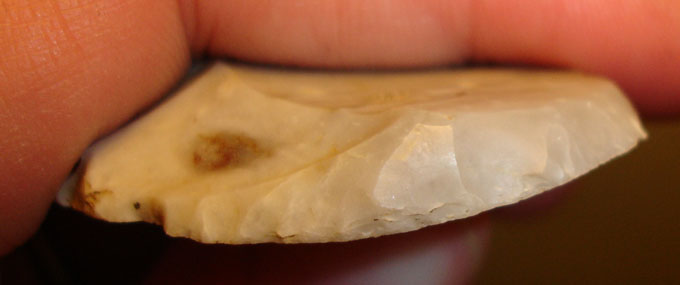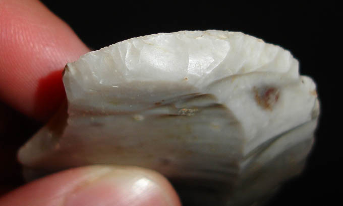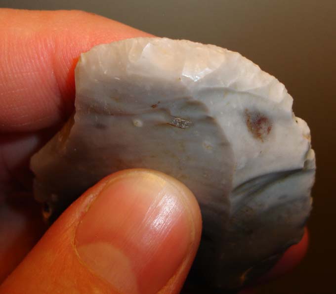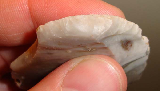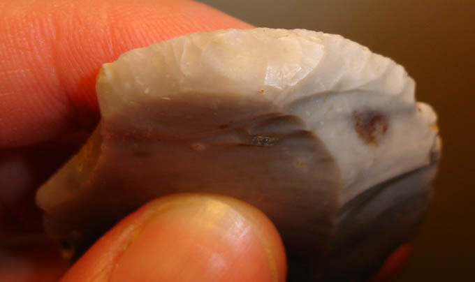 On voit bien le front du grattoir mais je me demande si il n'y a pas également un coup du burin (sur la gauche sur les photos de face et sur le haut, à droite, sur la photo vue du dessus). Qu'en pensez vous?
