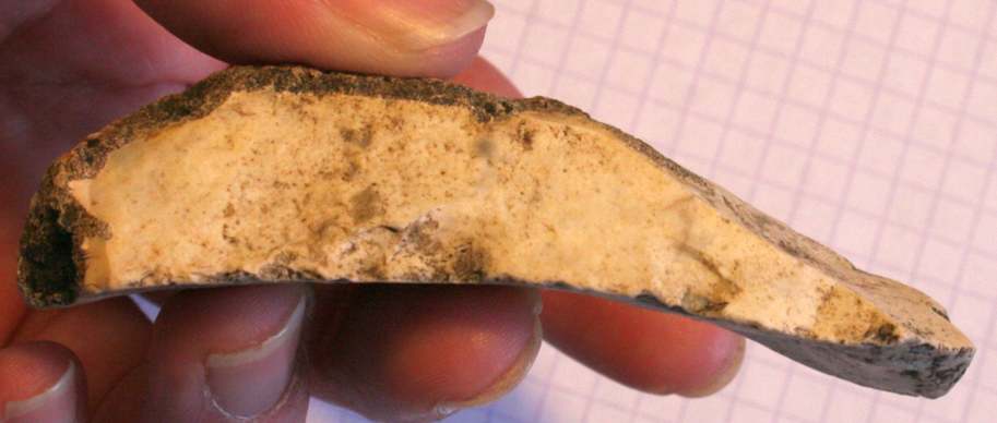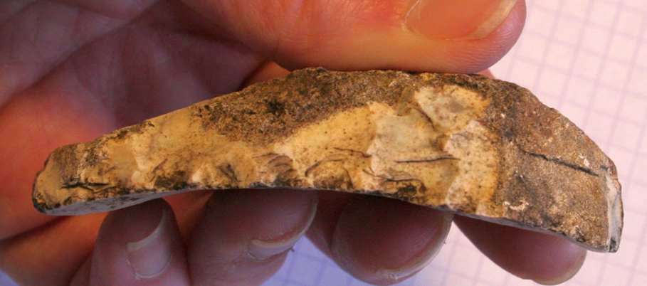 En fait ce que je voulais dire par bord abattu, c'est qu'il y a un enlèvement (sur le coté opposé au denticulé qui courre sur tout le long de la pièce)... bon ce n'est sans doute pas un bord abattu dans le sens typologique du terme...