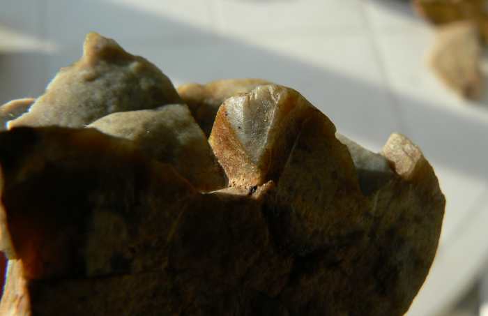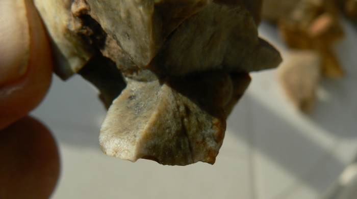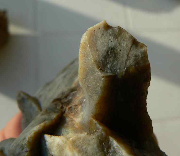 ...Les deux photos qui suivent représentent une zone sur la base en considérent que celle-ci est le seul endroit du silex ou il y a de la patine.
