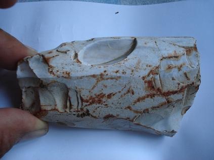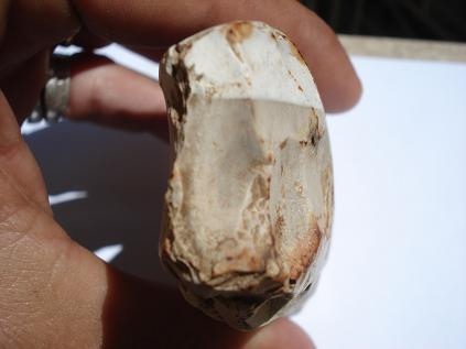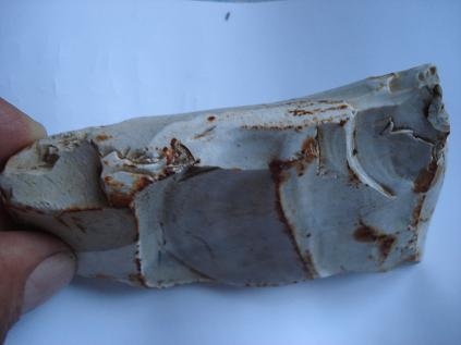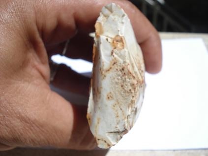 [1339] bonjour mon forum favori! Merci neodom34 de t'être penché sur ce cas! Dans la photo ci-jointe j'ai essayé de faire ressortir le coté poli de la chose, l'on voit aussi très bien comme deux arrêtes de guidage... dont l'une est bien visible sur la photo...! La courbe de cette face est parfaite quand on l'a en main...et très bien lissé...! Pour ce qui est des enlèvements plus ou moins rectangulaire de l'autre face...mystère et boule de gomme! Merci encore pour tes explications éclairées!