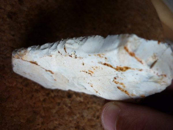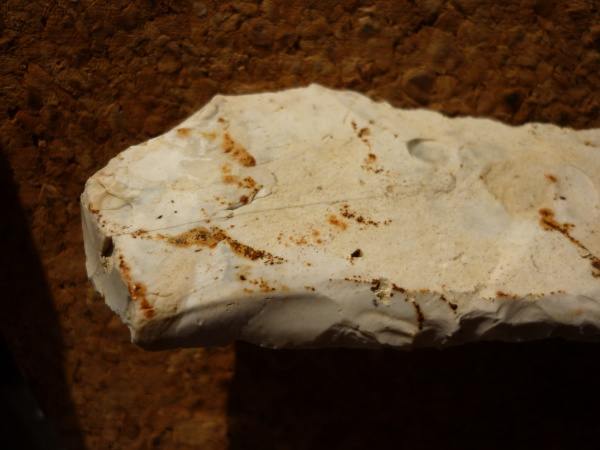 J'ai pas l'impression qu'il y ai un bulbe ou des traces circulaires ; je t'envoie une nouvelle photo de la zone concernée. Pourtant lorsque l'on voit le talon de l'outil il semble bien qu'il y ai eu un plan de frappe ?