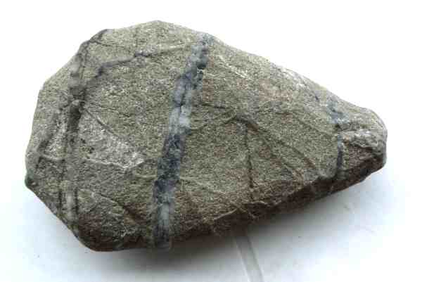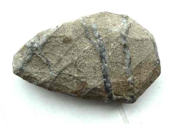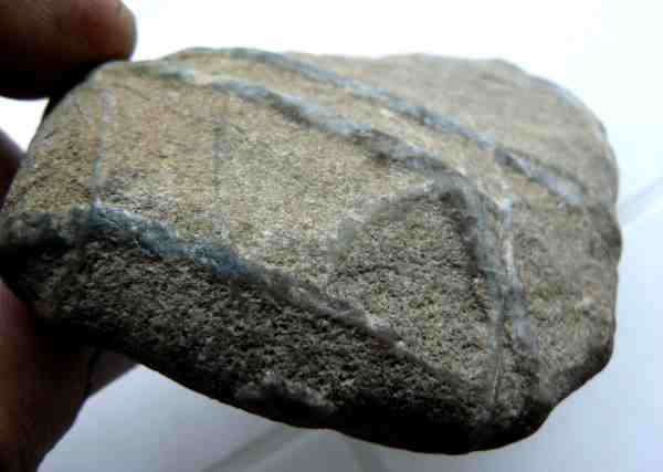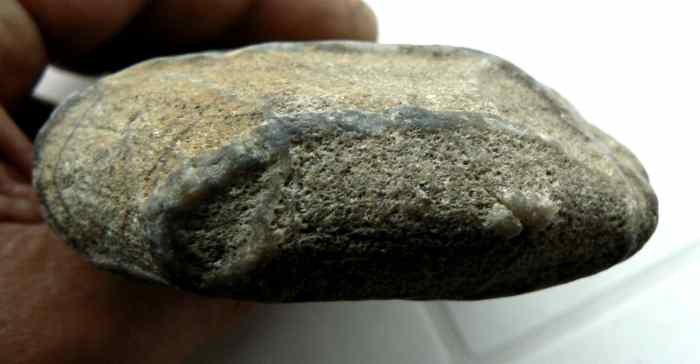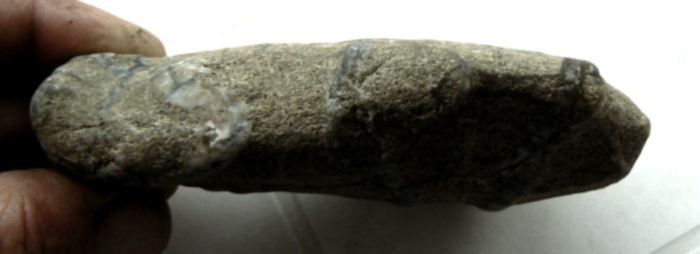 Trouvé cette pierre, en grès ? , veiné de quartz gris sur la rive d'un estuaire qui traverse des dunes, le grès plus tendre a subi l'érosion et laissé le quartz certainement plus dur en relief, je l'ai ramassé car j'ai trouvé sa forme et sa texture sympa elle dénotait parmi les autres galets plats, est-ce une éolithe ou un simple galet ? Merci pour vos avis.