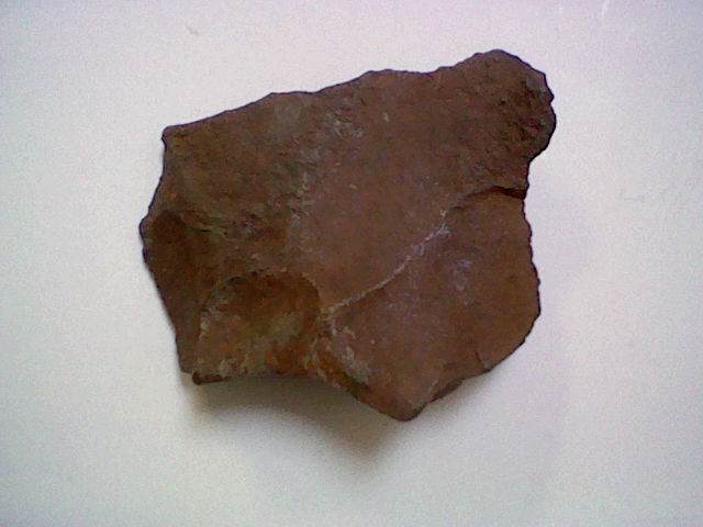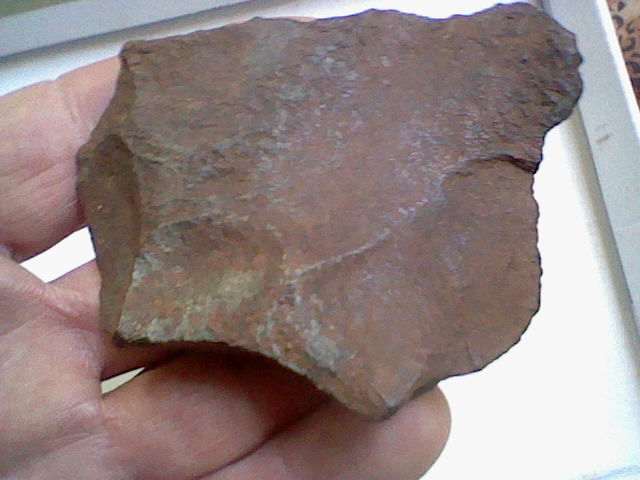 En R0, je pense à un racloir en quartzite, une photo du tranchant à droite permetterait de voir les esquilles d'usage, ce ton ocre rouge ou jaune provient certainement d'oxydes ferreux, l'intérieur est souvent noir ou d'un brun très foncé,je joins quelques photos d'un racloir et d'un grattoir du même matériau toujours trouvé sur l'estran que je n'ose plus trop poster pour éviter les moqueries, en R5 cela ressemble à du jaspe ou de la calcédoine, ta pierre fétiche. J'en ai aussi trouvé dans des marais à plusieurs kms de la côte. Cordialement.