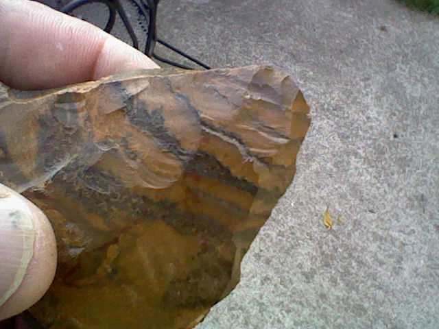 Huit jours !!! comme quoi on est vite accroc à nos gadgets. On parle de la même chose cédoine, comme lorsque tu me disais dans un de mes posts directement arraché à l'estran, peut-être taillé sur place et ramené sur la terre ferme.Quinconce, coquillage, conchoïdal en forme de coquille St Jacques vu de profil, ta pierre en caramel mou est très jolie, on dirait un grattoir sur museau, pourrais-tu nous la monter dans son intégralité. Cordialement.