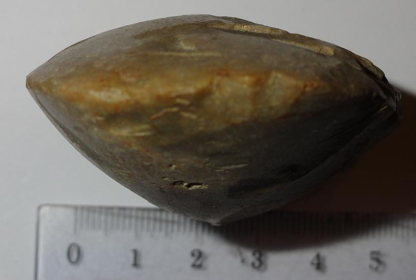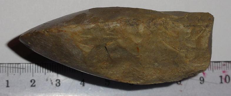 Par contre dans le cas présent on ne peut dire si cet objet a été emmanché comme une de nos haches actuelles ou comme une pioche ( donc herminette ). Il me semble que la partie cassée a été réaménagée pour repermettre un emmanchement. Sur la 540 les arêtes de la cassure sont arrondies, émoussées,donc la cassure pourrait être ancienne