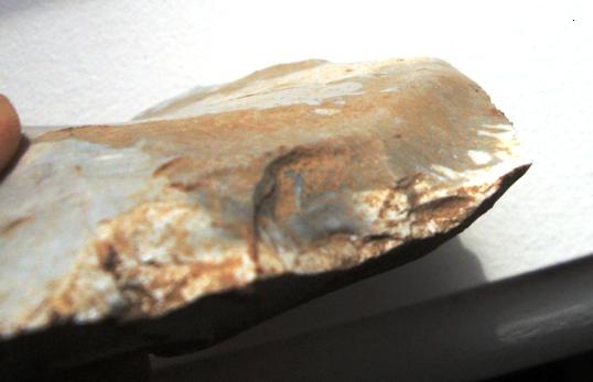 En fait ce que l'on voit au premier plan sur la photo, serait (à mon avis) un enlèvement (un peu brutal) pouvant servir a produire un éclat sur la face inférieur... (si je ne dis pas trop de bêtises)