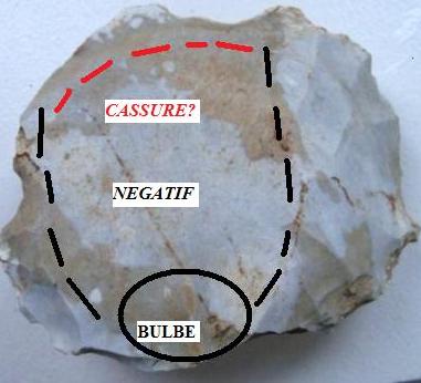 J'ai sans doute été trop rapide dans ma question. Voici un nouveau dessin de ma question. Je vois bien le bulbe, les bords de l'éclat qui été débité (pointillé noirs) et, au bout, en pointillé rouge, on constate que l'éclat fait une 'marche', que j'ai pris en photo sur le post en R7 (regarder au deuxième plan).