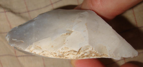 (les traces de chocs que l'on voit sur le ''tranchant'', me semblent plus compatible un débitage qqconque, qu'a des traces d'usures ou des retouches...)
