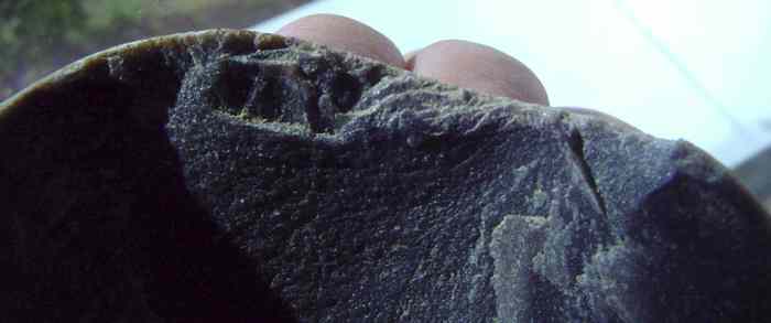 [888] zone particulièrement écrasée et bouchardée au milieu du tranchant
