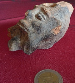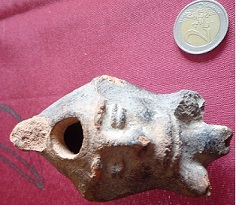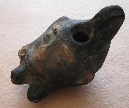 La lampe est en argile, avec comme décor un visage de type plutôt africain, origine perse, byzantine, mésopotamienne, reproduction?????