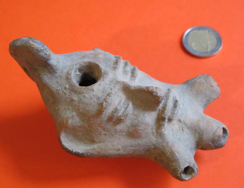 [Temp7] merci, c'est ce que m'avait dit la personne qui me la offerte mais il n'était pas sûr de son origine ni de sa datation. De plus je n'en ai pas trouvé de similaire sur le net , toutes les lampes romaines que j'ai vu étaient plates sur le dessus . Celle ci a une forme particulière et trois becs qui sont malheureusement cassés