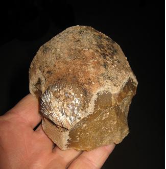 je pense a un nucleus qui a été abandonné a cause d'un défaut , en R3 au pied du coquillage et sur toute la largeur , je crois apercevoir une ligne de fracture .