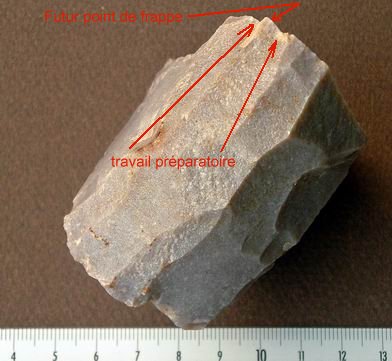 Concernant le nucléus, je le trouve superbe car il possède un bon plan de ravivage, tout neuf ainsi qu'une préparation préalable au détachement d'une lame. Il manquait plus qu'un petit coup pour que la lame se détache...