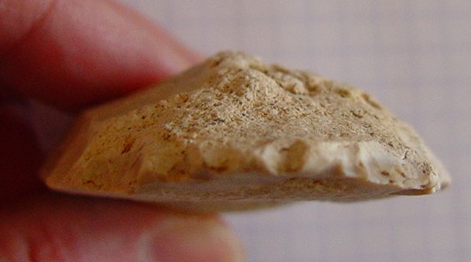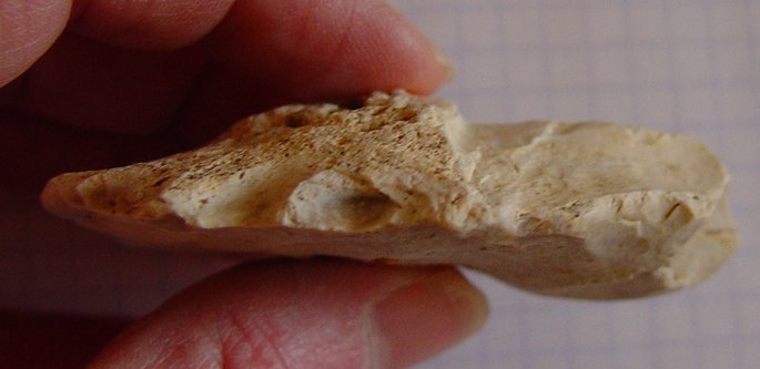 Je viens de refaire une autre photo de cette zone, ou l'on voit mieux la structure du talon, l'endroit où a été percuté l'eclat (et qui a donné le bulbe se situe approximativement en haut à droite), alors que l'esquille est plus ou moins dans l'axe de ce que j'appelle l'enlèvement secondaire.