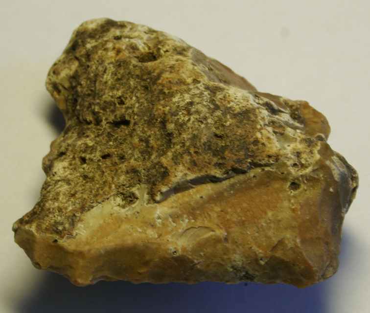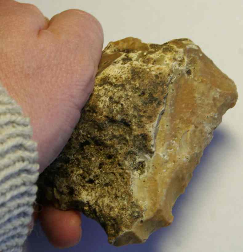 Il y a une jolie empreinte de fossile sur le coté. l'extrémité opposé au tranchant a été abattue, et il a été qq eu rabotté sur le coté (à coté du fossile) pour facilité la prise en main.