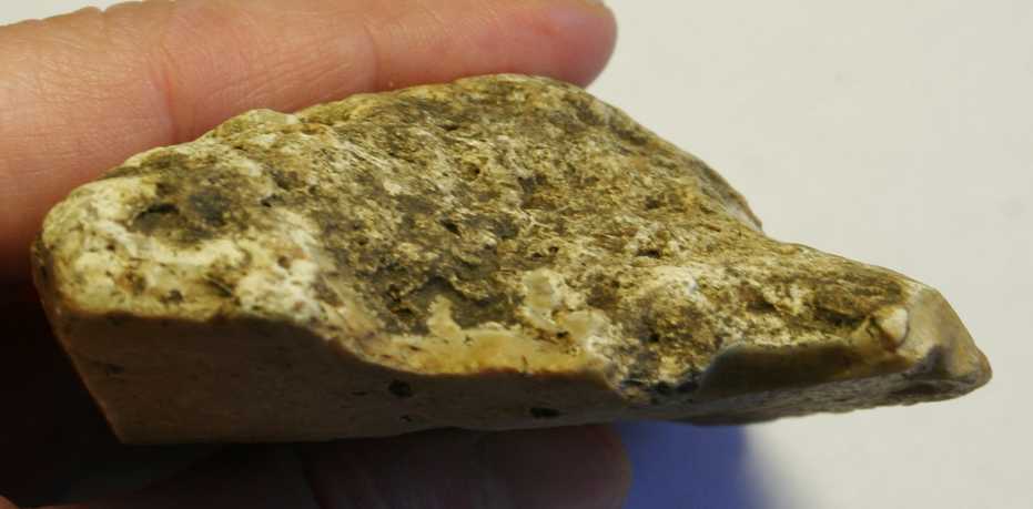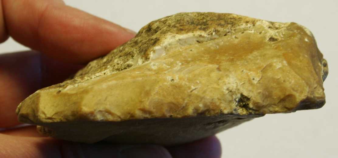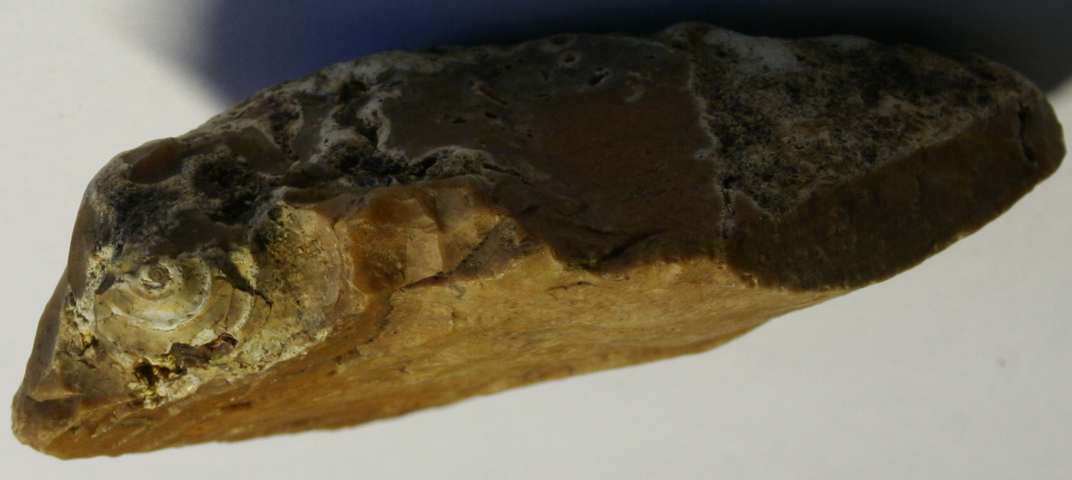 [1501] à coté du fossile, on remarque une zone plus ou moins raboté et l'extrémité biseauté qui en fait ce situe à l'opposé du tranchant...