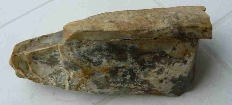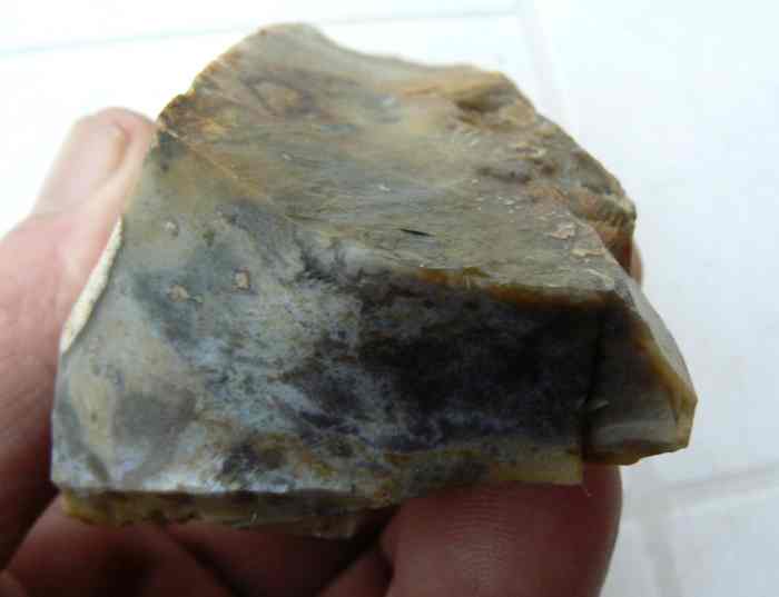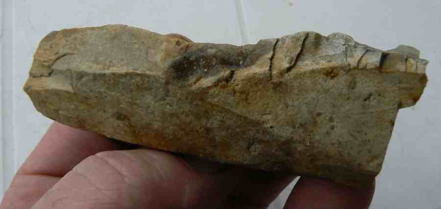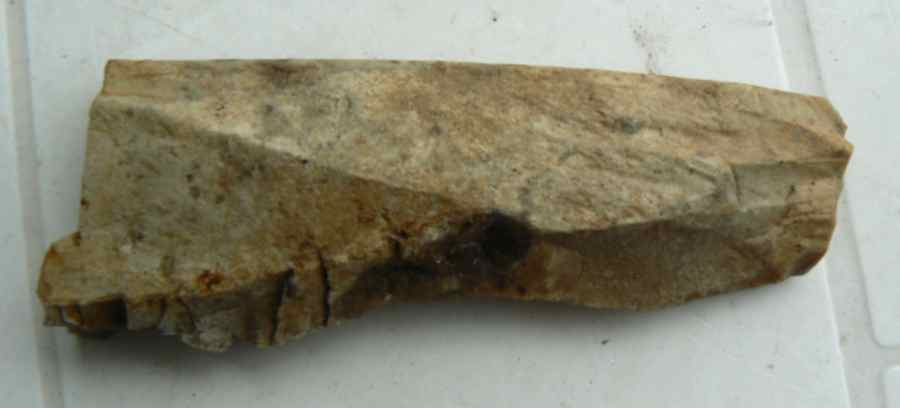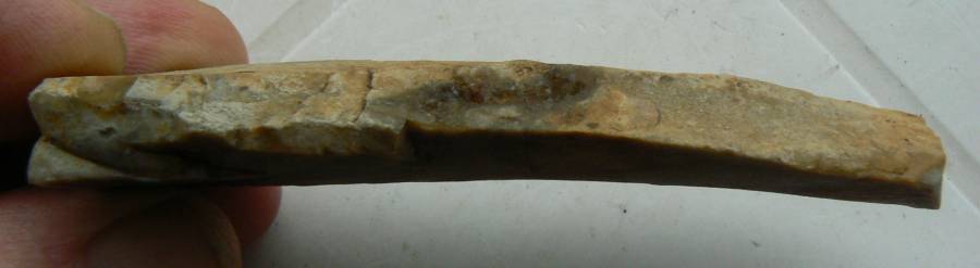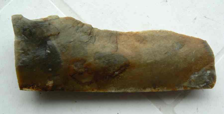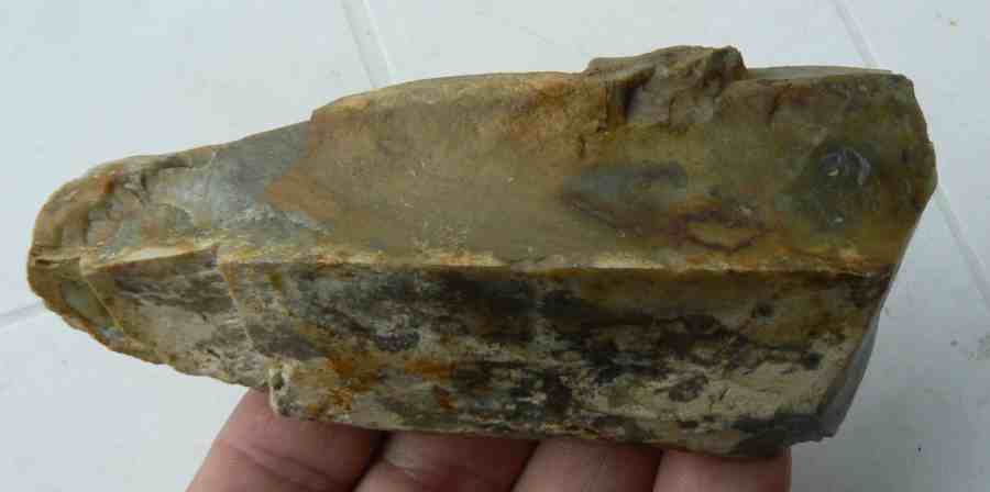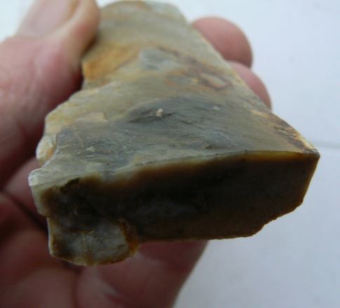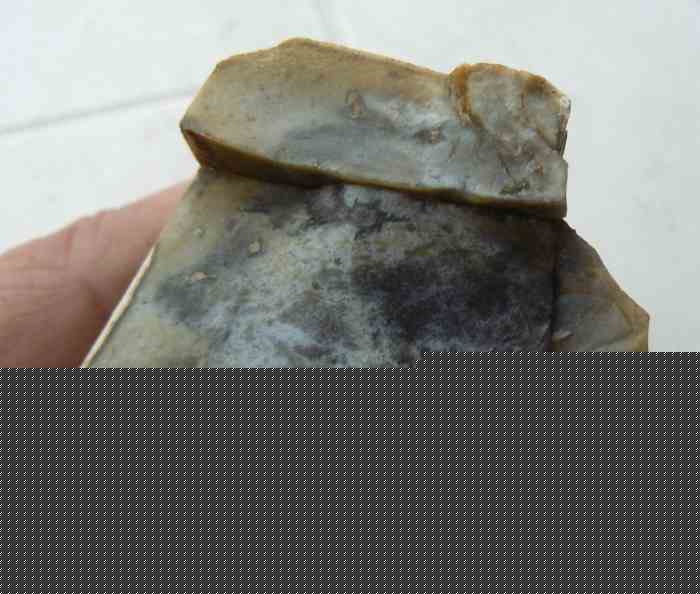 Ce n'est peut-être pas un couteau, mais c'est certainement une lame, je joins des photos de la tranche, pour rapiette, ça à l'air d'être du silex, mais bon ? Je vais poster ce que j'ai trouvé à coté . Le matériau est de piètre qualité. Sur la première photo le point d'impact se trouverait à un tiers à droite.