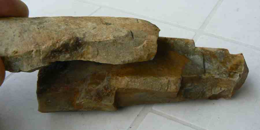 Ce post fait suite à celui au n° 88740 ou je faisais voir un nucléus et sa lame , celle-ci étant très mal foutue, Moldor et Bleiz avaient conclu que c'était l'action du gel, ce qui est fort possible, mais vu la qualité très moyenne de ce silex, il ne file pas comme celui de Pressigny ,je pense qu'elle aurait pu être anthropique. Je suis donc retourné dans ce petit bois de la Vienne et y ai trouvé quelques pieces sympa, que je vous posterais ultérieurement. Je vous poste donc pour commencer un nouveau nucléus et sa lame qui là n'est pas du au gel, je pense que cette lame a fini en couteau, on voit quelques petites retouches en bas à droite pour en solidifier l'extrémité, on les voit mieux sur la dernière photo. Merci pour vos avis et commentaires.