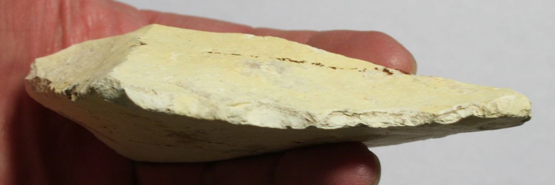 Voici une pointe triangulaire d'à peu près 10cm de long, celle-ci est (ou plutot était, la patine a un peu souffert) retouché sur les deux cotés.