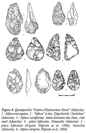 Une planche de quelques rares bifaces trouvés dans le Cotentin.