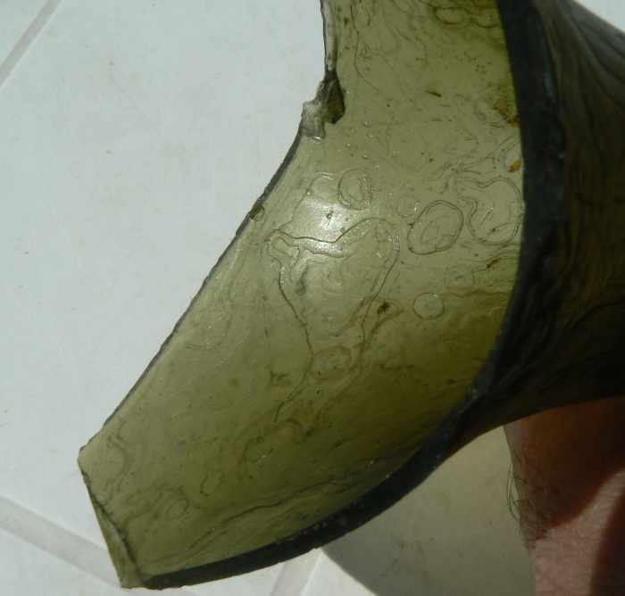 Concernant le goulot, on doit arriver à ce genre de déco en soufflant du verre bourré de gaz. Les bulles peuvent bien créer ce genre de motifs.