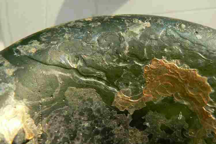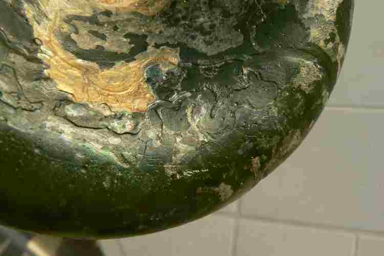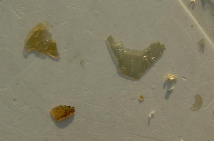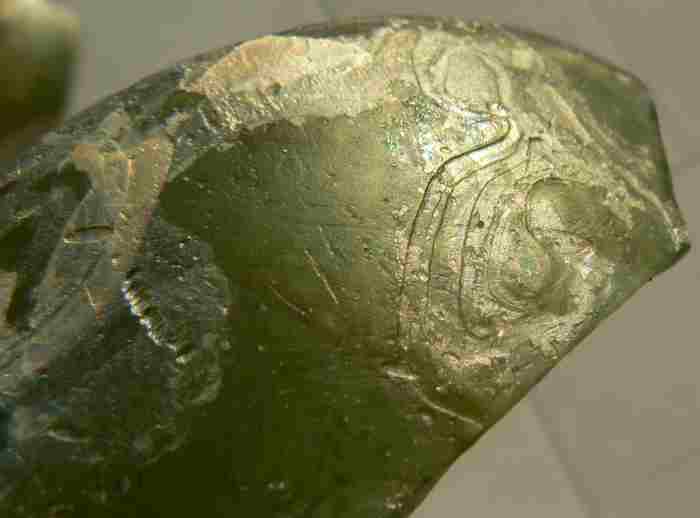 Je pense avoir trouvé l'origine de ce que l'on croit être des motifs de décor.En voulant pousser le nettoyage de la bouteille oignon, j'ai commencé à gratter au scalpel ces sortes de pellicules dorées qui sont le résultat de la désagrégation du verre et je me suis aperçu que c'était ces pellicules qui laissaient des traces dans le verre sain. Je joins quelques photos explicatives.