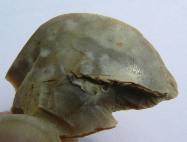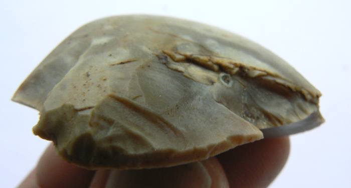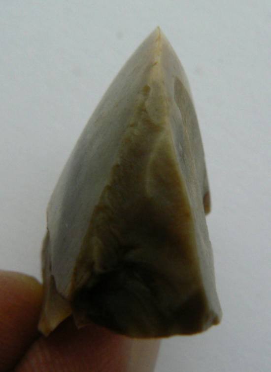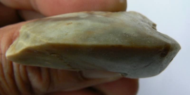 Parti faire une petite balade digestive dans les champs après le repas , je ne peux m'empêcher d'avoir les yeux qui traînent entre les sillons, le champ est surtout rempli de quartz blanc éclaté par la charrue. J'y trouve d'abord un petit grattoir de 4 cms que je pense en quartzite ( photo fin du topic ) puis ce morceau de silex de 5 cms au plus large que j'ai d'abord pris pour un éclat avant son nettoyage.Je pense que cette hache n'a pas été éclaté par la charrue mais de son 'vivant' si j'ose dire, on y voit des retouches (trois photos fin de topic) et un point de percussion en R3.