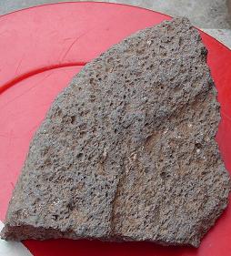 D'après mes suppositions ce serait un morceau de meule( à quoi?) en rhyolite de l'estérel (?) qui ferait entre 30cm et 35 cm de diamètre.
