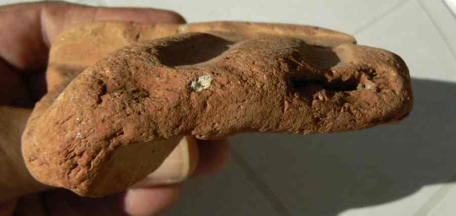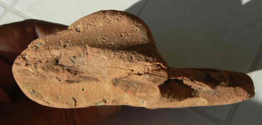 Trouvé récemment ce tesson de poterie bien rincé au pied d'une falaise. Au début j'ai cru que c'était un déchet moderne genre tuile mécanique, mais à y regarder de plus près cela pourrait être plus ancien. Je trouve que les cannelures ne sont pas très symétriques, il y a ce petit 'chapiteau' et les parties plus foncées ressemble à de l'engobe. Merci pour vos avis.