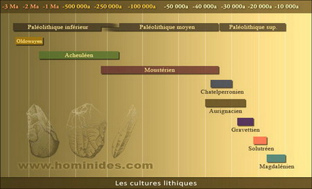 Tout simplement, la période acheuléenne par exemple à une durée énorme (voir le tableau ci-joint) , alors si on trouve des outils acheuléens dans les pays voisins, ma question est directement : quel est l'âge de ces sites ? Il y a beaucoup de choses qui se sont passées en 500 000 ans et aussi des formes différentes de fossiles humains. Donc si on retrouve des outils de ce type chez nos voisins, ce ne sont pas nécessairement les mêmes types humains qui en sont le fabricants. Or pour moi, comme chaque outil est fabriqué par un être humains, duquel s'agit-il et de quelle période date-t-il ? Un outil acheuléen de 500 000 ans d'âge n'est pas fabriqué par le même type d'homme que celui qui date de 250 00 ans et certainement pas pas par nos cousins les néanderthaliens .