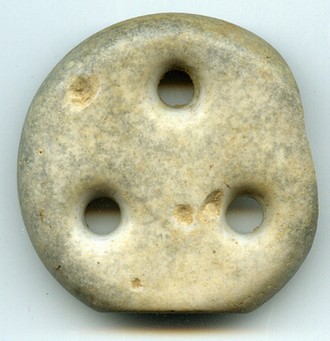 Voici une pierre trouée trouvée en contexte GR. Elle mesure 5 cm de diamètre pour 1,3 cm d'épaisseur. Les trois trous sont écartées de 2,3 cm (entre axe) pour un diamètre de 0,6 cm.