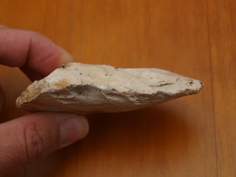 J'ai dit que l'outil présenté par Thierry est taillé vers la pointe des deux côtés (donc taille bifaciale) et que pour son utilisation éventuelle je le classerai dans les racloirs.