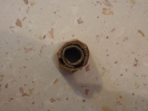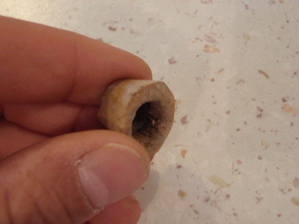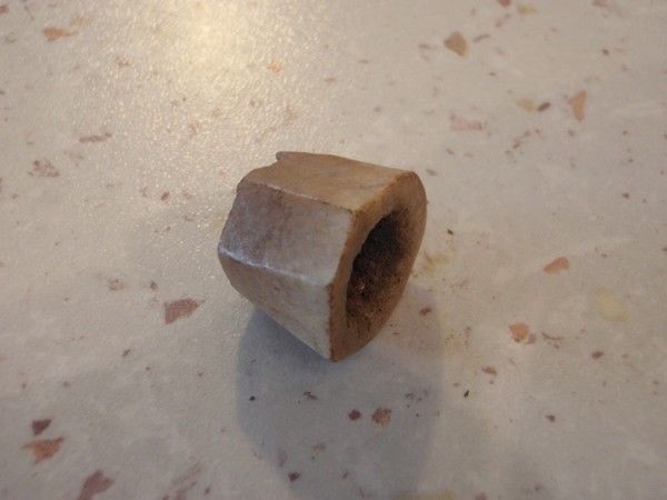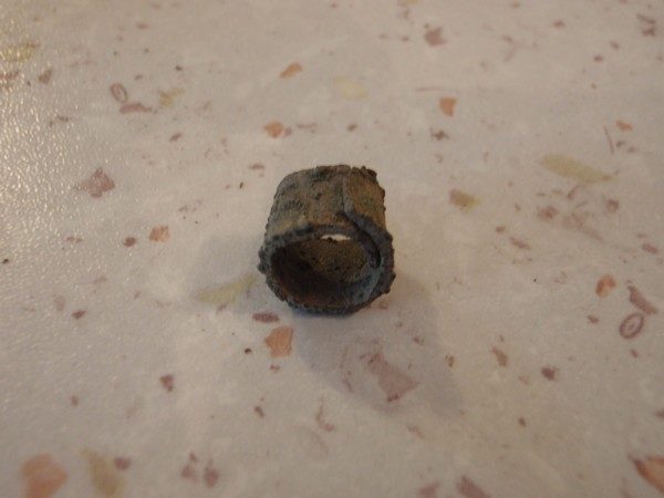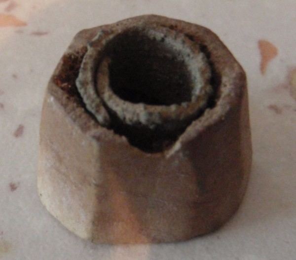 à tous, voici un os taillé en 8 cÎtés avec à l'intérieur un petit rouleau, perle?? de cuivre. L'os fait 15mm de long pour un diamÚtre 15mm au plus petit et 21mm au plus grand, le truc en cuivre 8mm de long pour un diamÚtre de 10mm. La partie en cuivre ne s'emboite que dans un sens et d'une seule façon. Alors si vous avez une idée????? merci à tous arvi pa