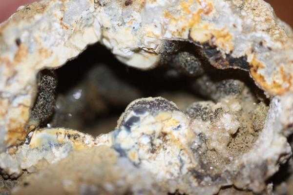 Pour l'intérieur, les dépôts noirs, sont a priori de l'oxyde de Manganèse (c'est assez fréquent...)