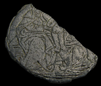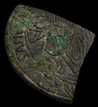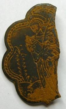 - Le deuxième se rend, malgré le fait qu'il soit plus fragmentaire, après quelques recherches dans la base de données : ce livre et surtout la palme que l'on voit dans la main gauche du personnage évoquent les boutons-enseignes de Sainte Barbe. Sans doute y avait-il la tour de sa légende derrière elle (voir R0). Cette identification est juste si tu confirmes que la dernière lettre de la légende, juste avant la cassure est un B... SANCTA B[ARBARA ORA PRO NOBIS], Ste Barbe, priez pour nous.
