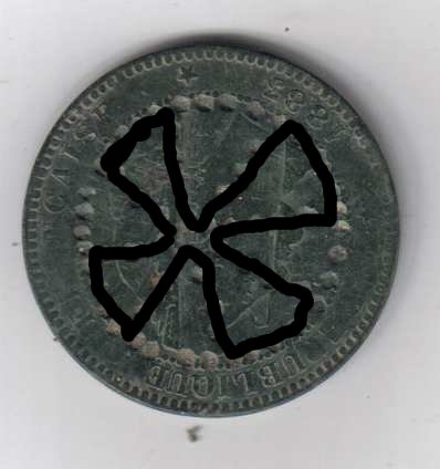 Aucune idée, mais en R1 si tu tourne de 180 degrés on peut lire 1883 en reliant les points, ce qui correspond à l'année de la pièce. Voilà , je sais pas si ça peut faire avancer l'enquête.