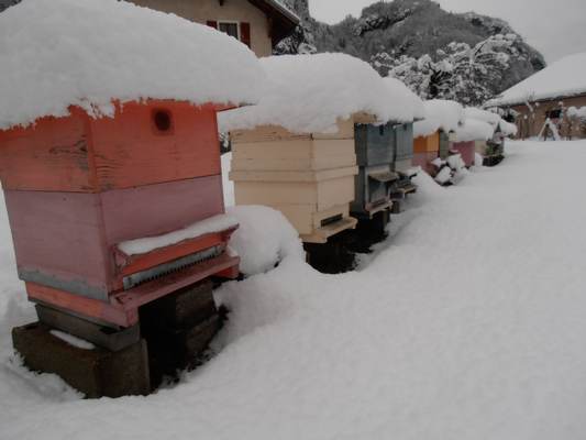 VoilĂ mon rucher aujourd'hui !!! Surtout ne pas faire de bruit pour ne pas les dĂ©ranger, mĂȘme pas aller enlever la neige sur la planche de vol...