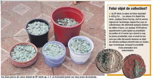 En 2008, 90 kilos de monnaies du IIIe s apjc ont été découverts dans un jardin d'un pavillon .