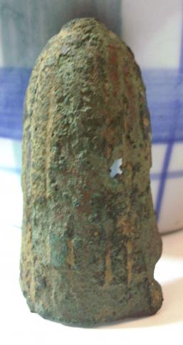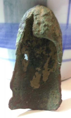 objet de 6cm de long, un peu plus de trois cent sur la plus grande largeur, bronze ou cuivre, présentant des rainures et un deuxiéme objet que je refourgue, mauvaise photo, et pas de succés pour l'identification, patine très verte, élément de mobilier?