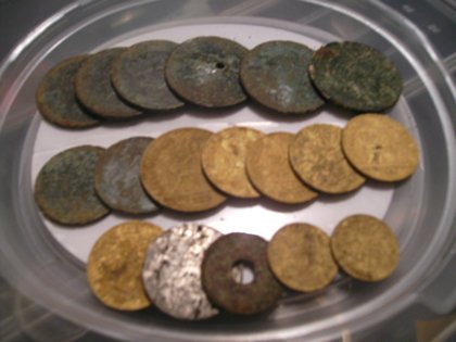 Malgré le froid, voici une p'tite boursée de 18 monnaies trouvée dans un sous-bois du Finistère! Mon disque sonnait à chaque passage!! 18 monnaies étendu sur une surface d'environ 1 m2, mélangée avec des petits blocs de rocher!