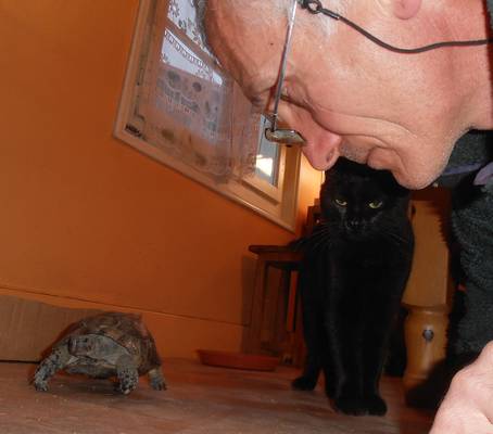 Une nouvelle copine pour Graphyte qui aimerait quand même bien qu'elle soit un peu plus joueuse...Graphyte participe aussi au 'dressage' il montre à la tortue comment me sauter sur les genoux, on ne désespère pas d'y arriver un jour ...