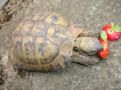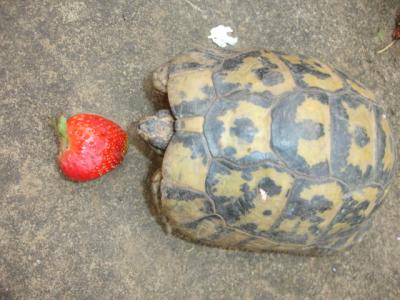 Mon père avait clos le jardin de la maison familiale d'un mur avec des fondations bien profondes. Du coup les tortues passent les beaux jours dehors et se débrouillent toutes seules (pissenlits, trèfle, cerises aigres, mirabelles...et même des limaces et des vers de rosée). Quand elles commencent à enterrer en octobre, je les mets dans un petit enclos avec des feuilles pour qu'elles s'entererent mais je je puisse les récupérer. Ensuite c'est direction la remise dans un carton plein de foin où elles passent l'hiver à l'abri du gel.
